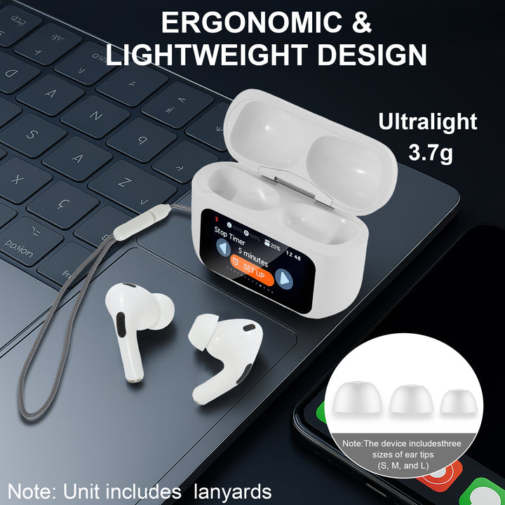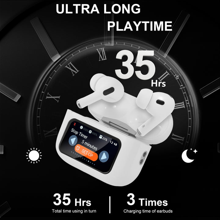 This wireless Earbuds is equipped with a large LED touch screen, it also has the functions of finding headphones, taking pictures, adjusting brightness, adjusting time, setting alarms, adjusting volume, skipping songs, displaying lyrics, etc. This Bluetooth Earbuds uses a 14.2mm double-layer diaphragm driver to provide strong bass, clear mid-range and bright treble. AHANSI Bluetooth headset can be used for up to 5 hours at a time, and the 500mAh charging box can charge the headset 4 times.