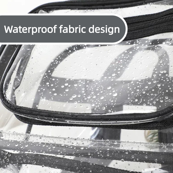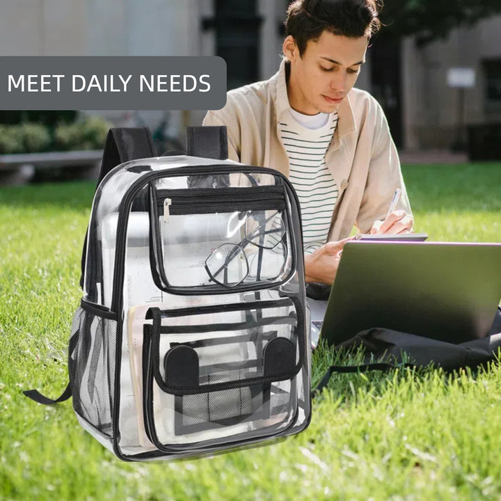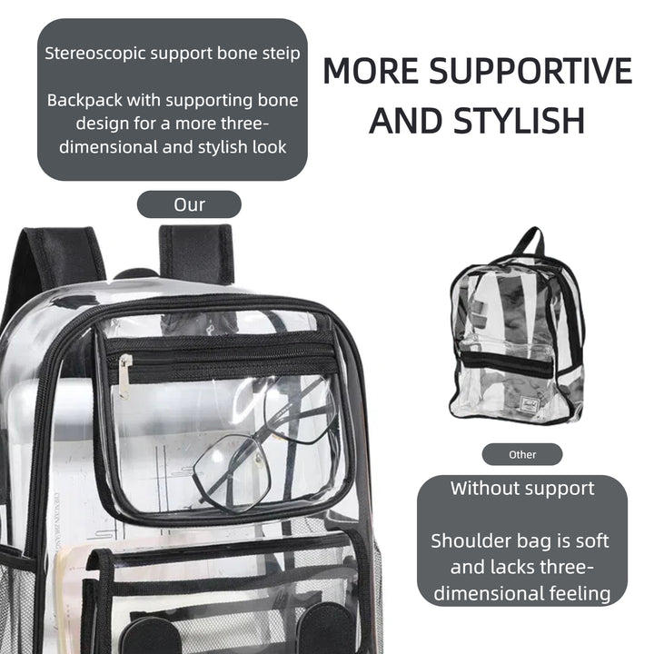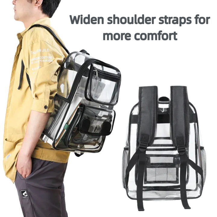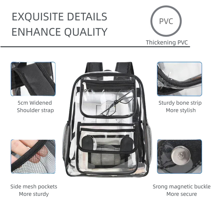 - Clear backpack for transporting school books and everyday gear; made of water-resistant PVC plastic