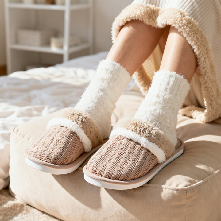 - Luxurious warmth and style! Made with premium breathable feather yarn and a plush slipper lining, the open toe locks in warmth and allows for breathability. The creative contrasting color design elevates loungewear to an elegant and fashionable look.