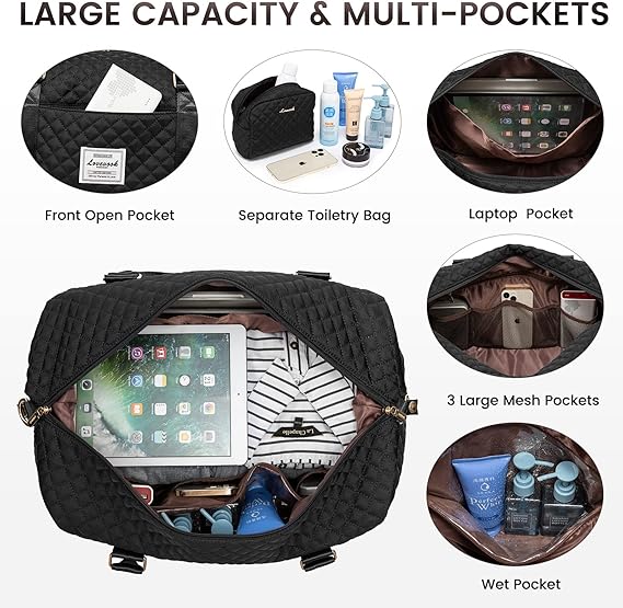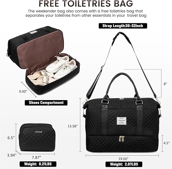 TRANSLINK travel bag for women comes with a $15 toiletry bag to store your cosmetics/toiletries. This large gym bag can even hold 3-5 days of daily essentials. Dimensions: 16.53 x 8.66 x 14 inches, 1.21 lbs. Fits in the overhead compartment as well as under the seat as a personal item in flight. There is a zipper pocket on the back for your smartphone, ID or passport. Can be used as a travel duffel bag, weekend bag for women, personal item travel bag, hospital mommy bag, gym bag for women, carry-on bag or laptop bag.